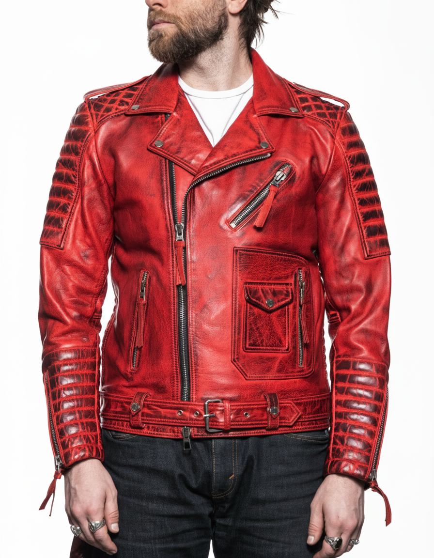 Crafted to your specifications, this men's burnished red motorcycle jacket represents the pinnacle of custom leather craftsmanship. Each piece is made-to-order, allowing you to personalize every detail—from fit adjustments and hardware selections to custom stitching and hardware placement. The rich burnished red leather develops character over time, aging beautifully with wear while maintaining its supple hand-feel and durability. Built for riders who demand both style and substance, this jacket combines classic motorcycle aesthetics with premium construction techniques. Whether you're refining the collar style, adjusting sleeve length, or requesting custom embroidery, our team accommodates your vision during checkout. The result is a one-of-a-kind piece tailored to your exact preferences and body measurements.