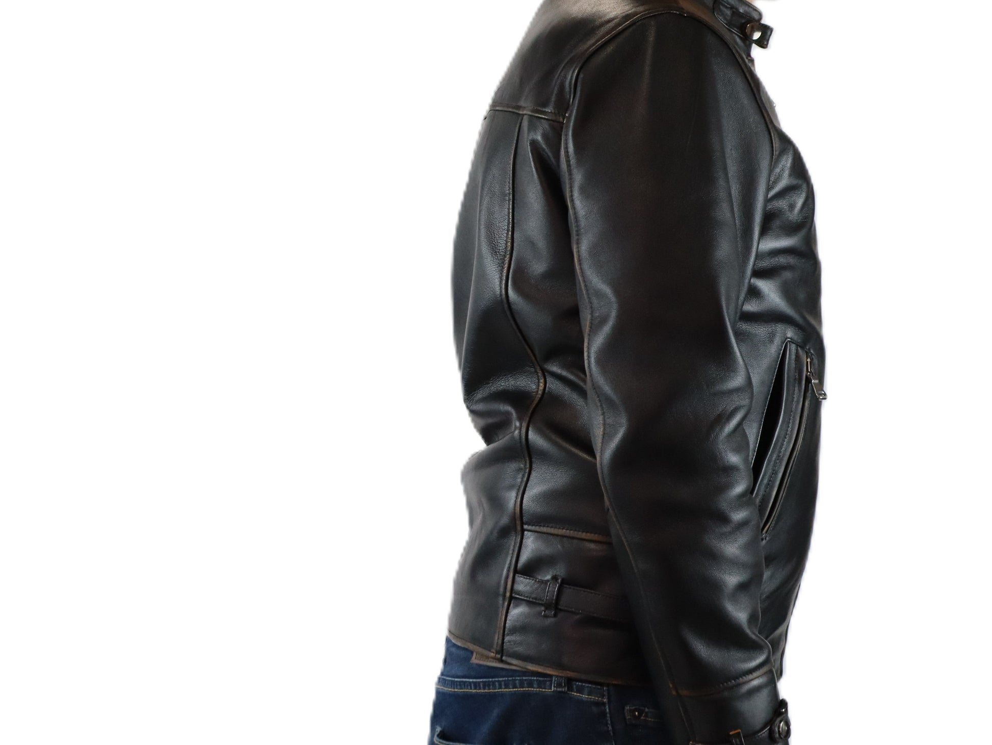 Crafted from premium sheepskin, this men's leather jacket features a refined antique edge finish that develops character over time. The full-length zip front combines with side and front top snap adjustments to deliver a tailored fit that adapts to your frame. Built for those who appreciate quality construction and understated sophistication.
