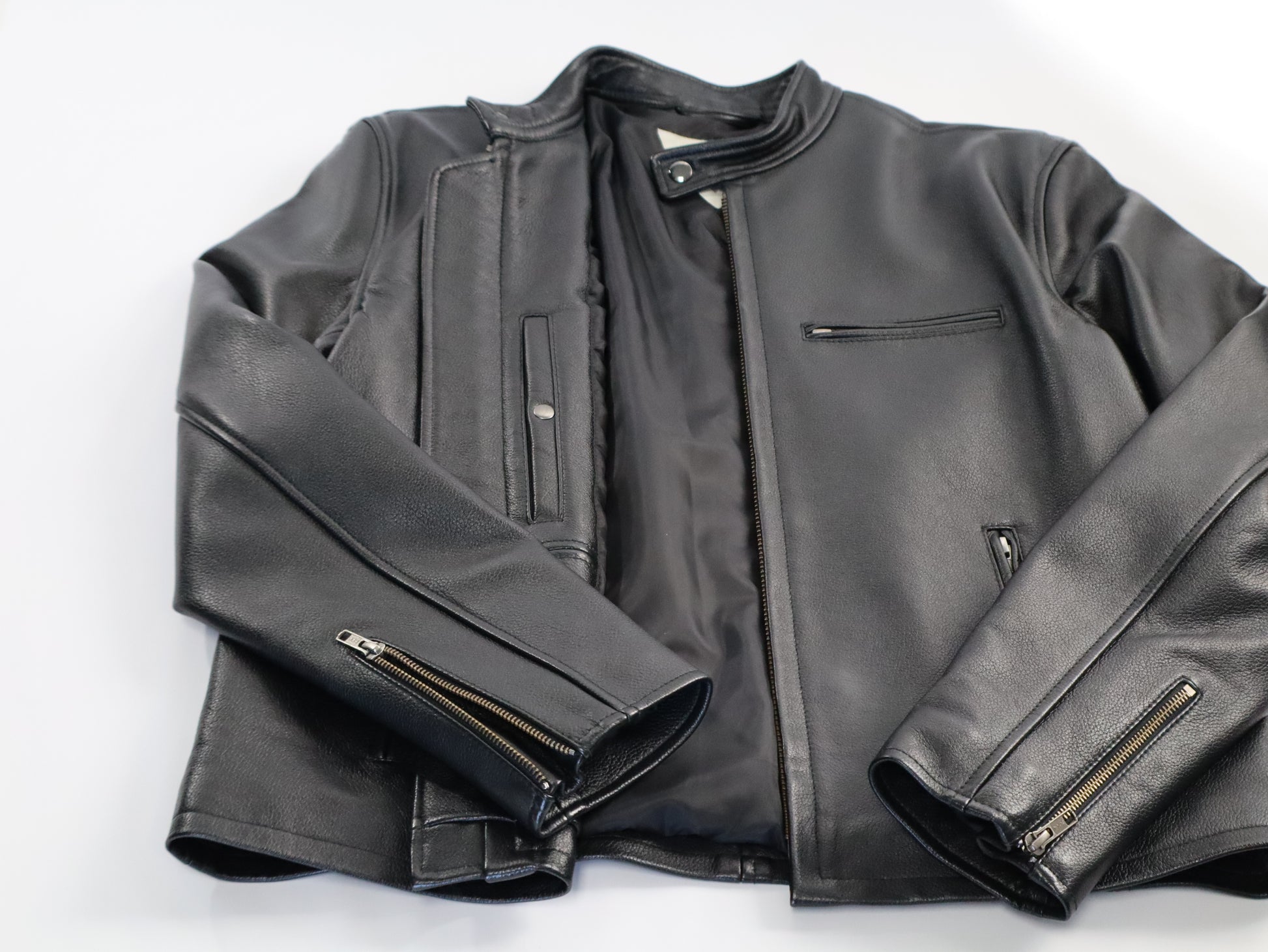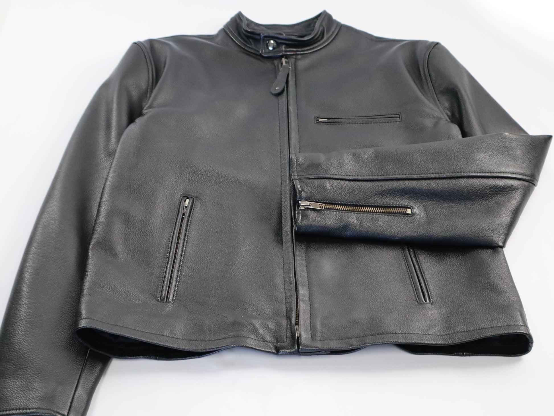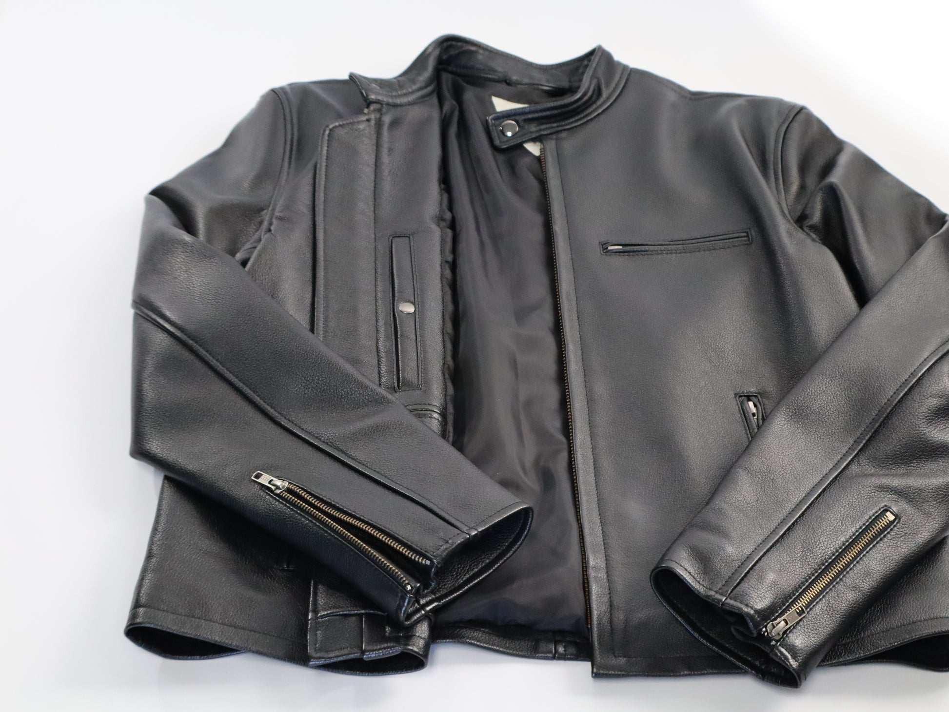 The Mens Cafe Racer Black Leather Jacket combines premium cowhide construction with refined midweight craftsmanship. This classic silhouette features subtle linear detailing that adds visual interest without compromising the relaxed, luxurious aesthetic. The supple leather develops character over time, while the expertly tailored fit delivers both comfort and timeless style. Perfect for the discerning man who appreciates quality materials and understated elegance.
