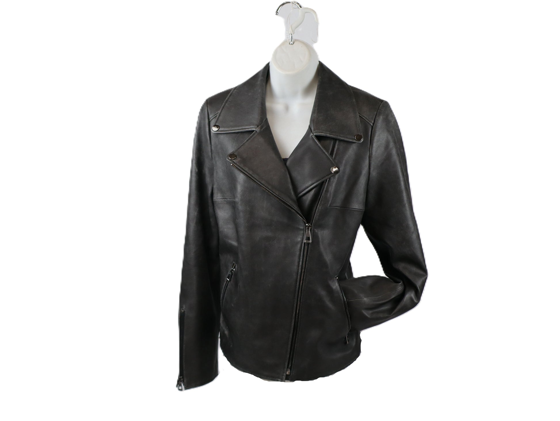 The Zayna leather moto jacket combines contemporary design with refined craftsmanship. This women's moto-inspired piece features ultra-soft leather construction in classic black and antique gray, delivering both style and comfort. Zip sleeves with leather accents allow effortless customization, while the lightweight silky finish ensures easy layering. A statement jacket that balances edgy aesthetics with wearable sophistication.